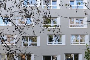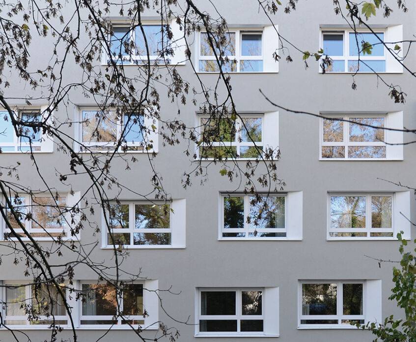 Die springende Fensterstruktur der Fassade ermöglicht den Rollstuhlfahrenden einen barrierefreien Blick nach Draußen. Deshalb findet sich in jedem Appartement und in den Gemeinschaftsräumen der WGs ein Fenster mit niedriger Brüstung.
