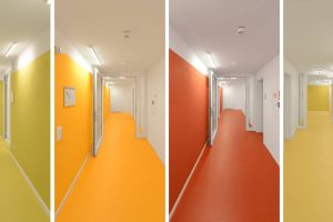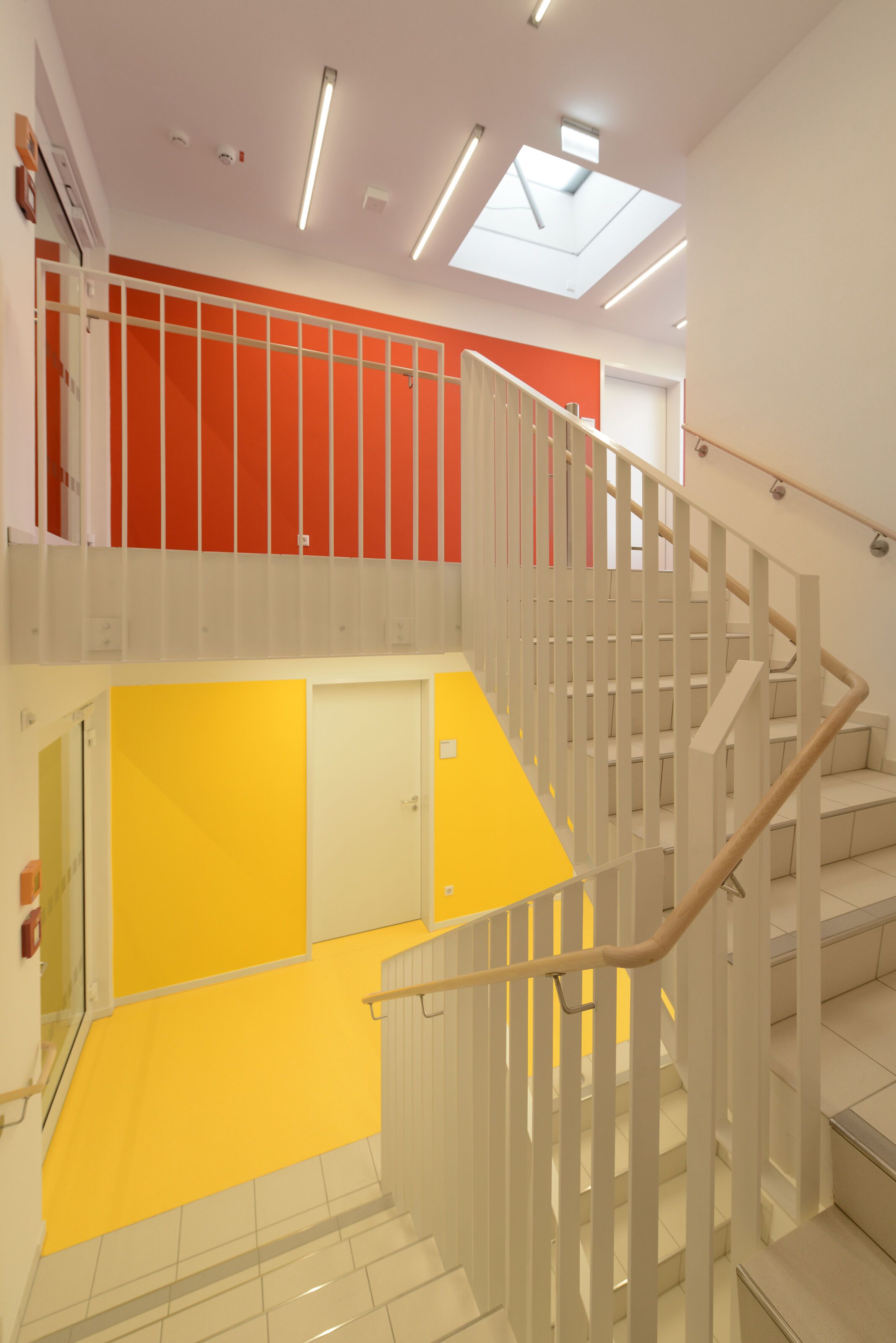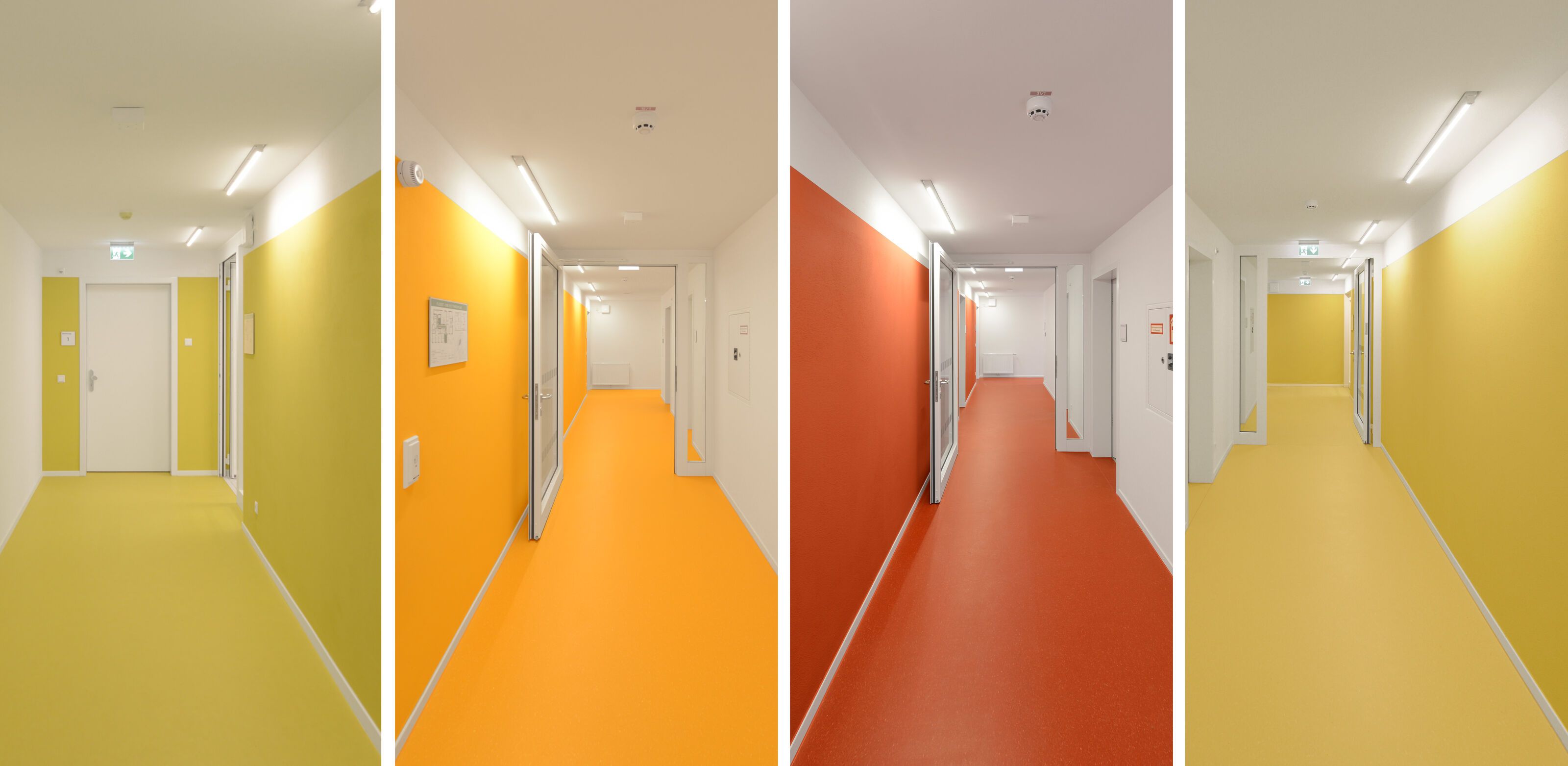 Damit sich die Bewohner:innen im Haus besser orientieren können, wurde jedem Stockwerk ein eigener, warmer Farbton zugewiesen. Dieser findet sich auch auf den Fliesen im Bad wieder.