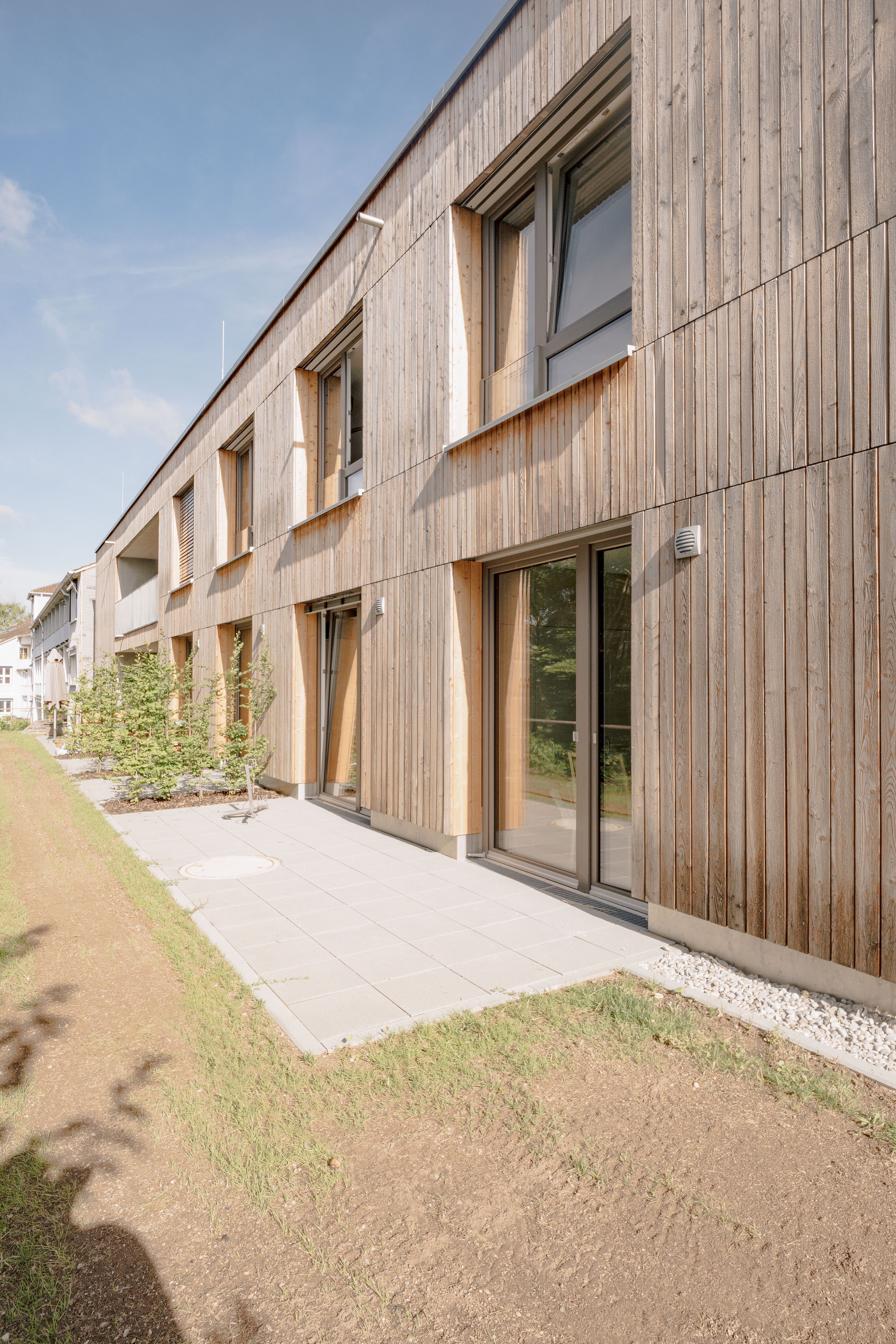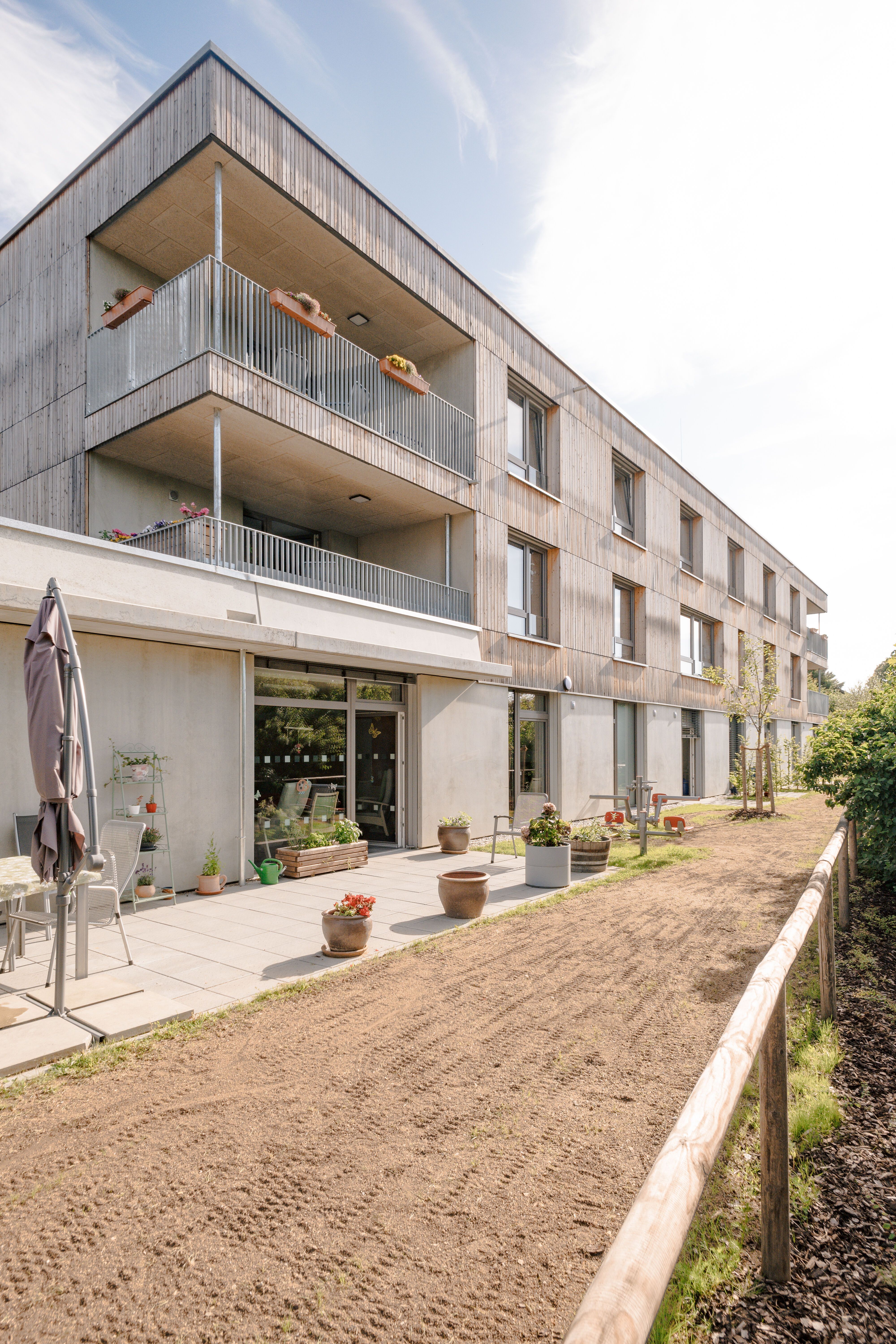 Projektiert wurde deshalb ein Gebäudekomplex mit verschiedenen Funktionsbereichen und einer Realisierung in zwei Bauabschnitten. Der erste, bereits fertiggestellte Bauabschnitt, umfasst zwei Wohngebäude (16 und 24 Plätze) mit 1,5-Zimmer-Apartments und Wohngemeinschaften für zwei bis sechs Bewohner:innen.
